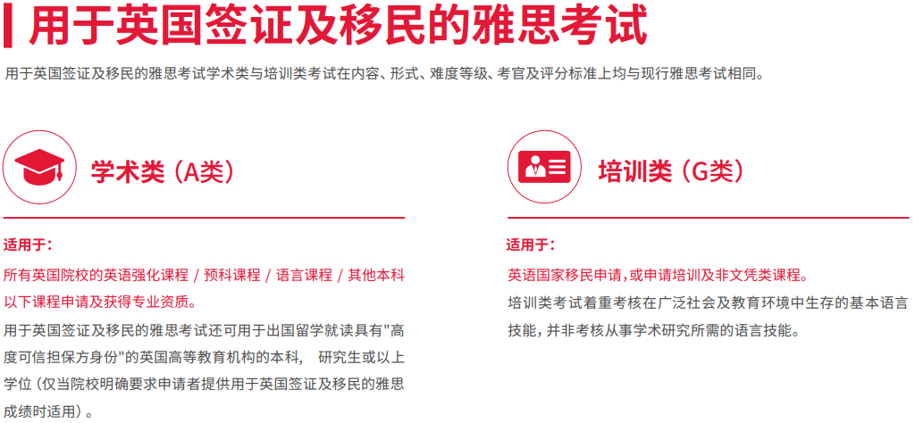 用于英国签证及移民的雅思考试(IELTS for UKVI)和普通雅思考试(IELTS)在考试形式、内容、评分和难度等级上完全一致,仅考试成绩单略有不同,其上会注明考生在英国内政部授权的用于英国签证及移民的雅思考试(IELTS for UKVI)考场参加的考试。