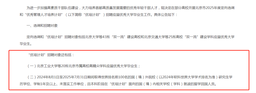 北京的要求是:2024年8月1日至2025年7月31日期间取得世界排名前100名的国(境)外院校(以2024年软科世界大学学术排名为准)研究生学历学位、学制1年及以上、未落实工作单位,且本科阶段在“优培计划”面向的国(境)内相关学校(学科)就读的留学回国人员。