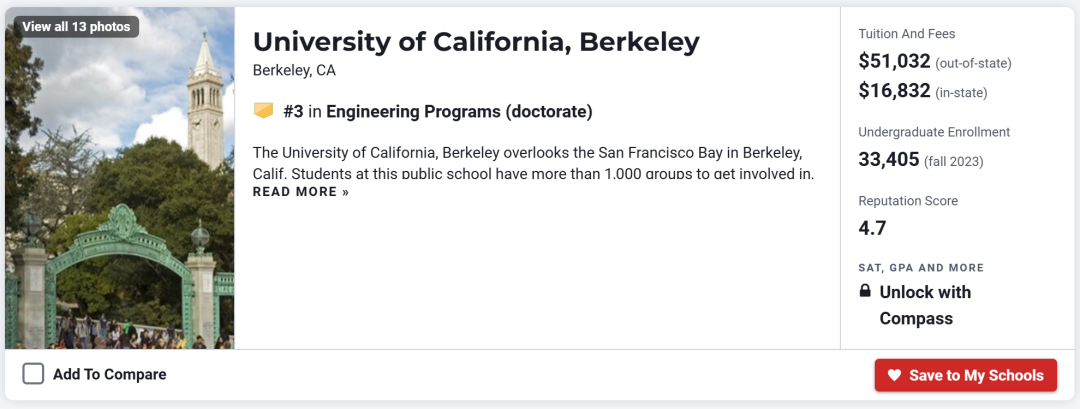 加州大学伯克利分校(UCB)是一所世界菁英公立研究型大学,坐落在美国旧金山湾区伯克利市,其工程学与斯坦福大学、麻省理工学院并驾齐驱,处于美国工程科学领域的最前沿,其工程学的各个细分方向也都位居全美前列。
