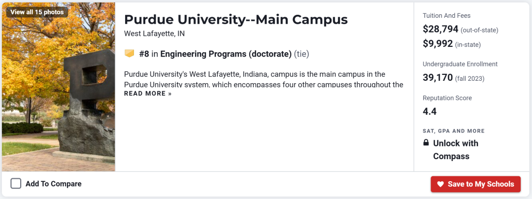 普渡大学非常注重理工科教育,在U.S.news全美最佳大学排名中常年名列Top50左右。在理工科领域,该校许多专业均位列全美前10。