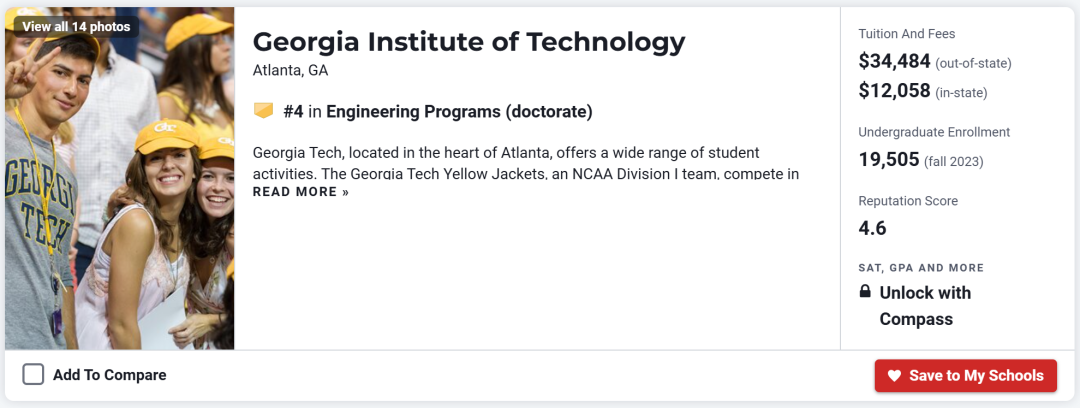 佐治亚理工学院与麻省理工学院、加州理工学院并称为美国三大理工学院,是美国南部最好的理工类院校之一。