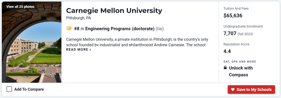 该校的计算机专业享誉全美,其软件工程专业更是遥遥领先于其它院校。学院拥有众多研究方向,如生物工程、化学工程、土木&环境工程、电子&计算机工程、工程学与公共政策、信息网络研究、材料科学与工程、机械工程等。