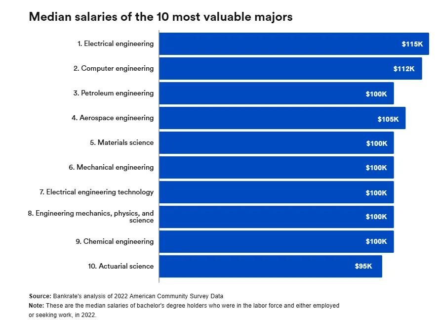 榜单中前十位分别为:电气工程、计算机工程、航空航天工程、石油工程、材料科学、机械工程、电机工程技术、工程力学&物理与科学、化学工程、精算科学。