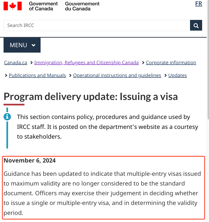 加拿大移民部(IRCC)在最近更新中调整了签证政策,从2024年11月6日起,不再统一签发有效期最长达10年的多次入境旅游签证,而是由签证官自行决定签发单次或多次入境签证,并确定适当的有效期。