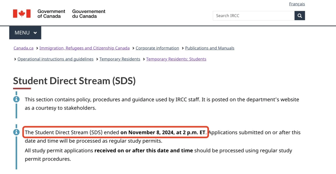 毫无预警,加拿大移民、难民和公民部 (IRCC)在官网上突发公告,自2024年11月8日起, 不再接受通过SDS通道提交的学签申请。这意味着今后所有学签申请都将使用常规学签申请流程提交。