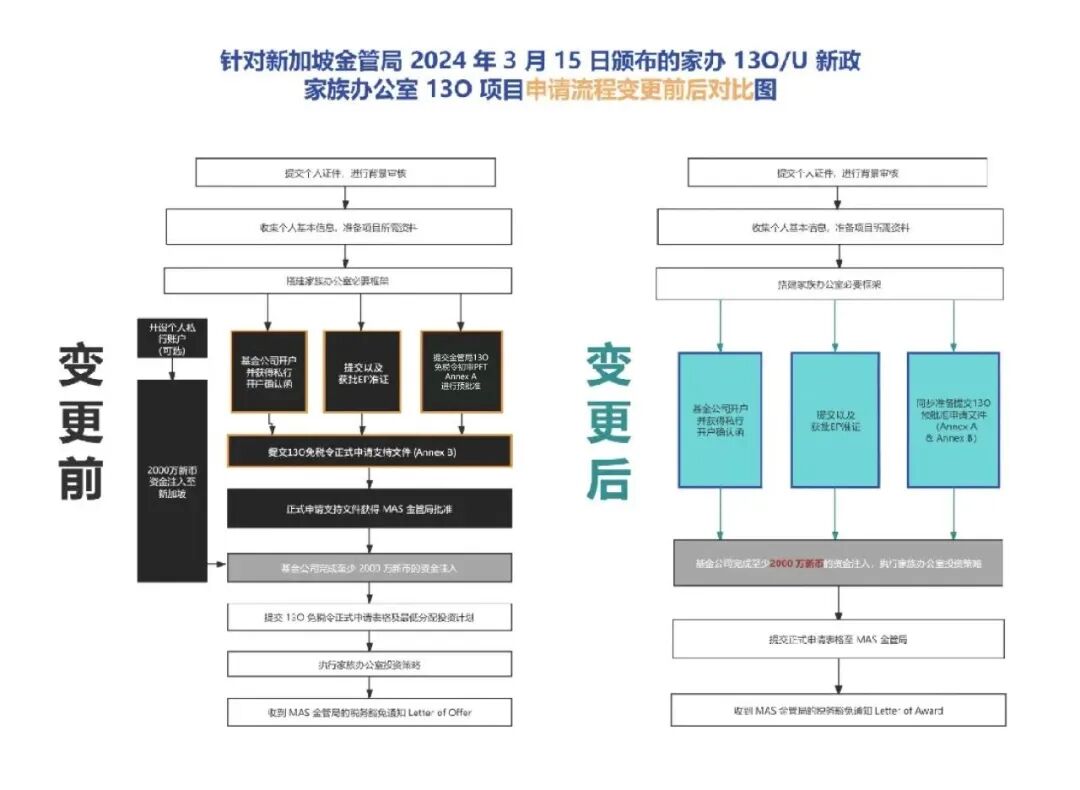自2024年3月15日起,新提交的家族办公室申请流程将得到精简化。个人与基金公司开户、申请工作签证EP等流程将进行优化调整,并实现在一个统一平台上提交。这些调整不仅简化了申请人的准备工作,还意味着主管官员(OIC)对整体家族办公室审批的速度将被缩短,从而提高了审批效率。