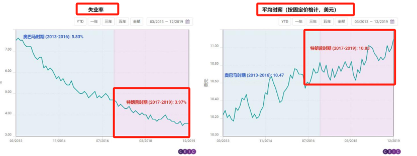 从数据可以得出,2019年9月失业率降至3.5%,创1969年11月以来新低;平均时薪也稳步提升,2019年12月按实际值计平均时薪达到11.09美元的历史新高。