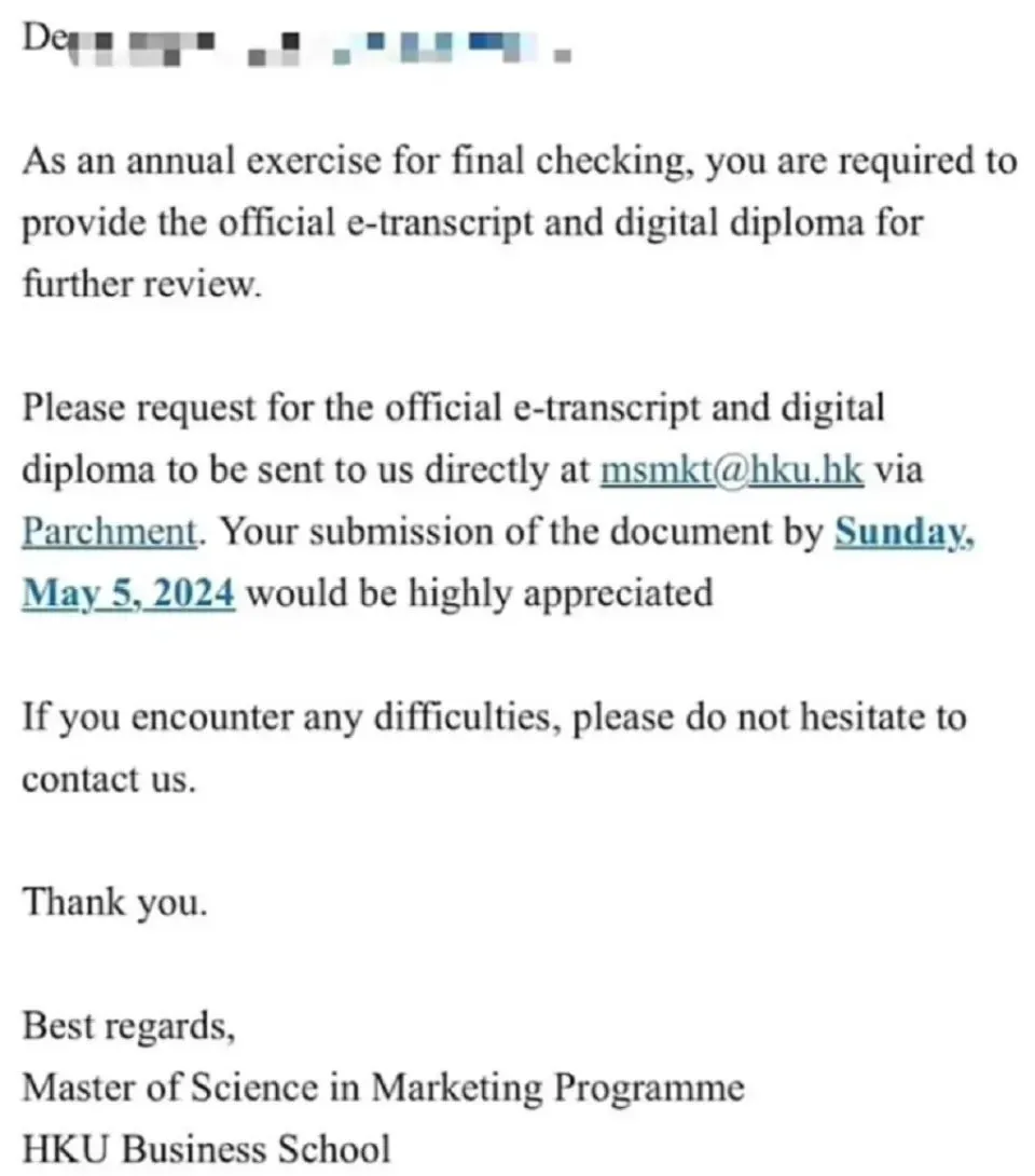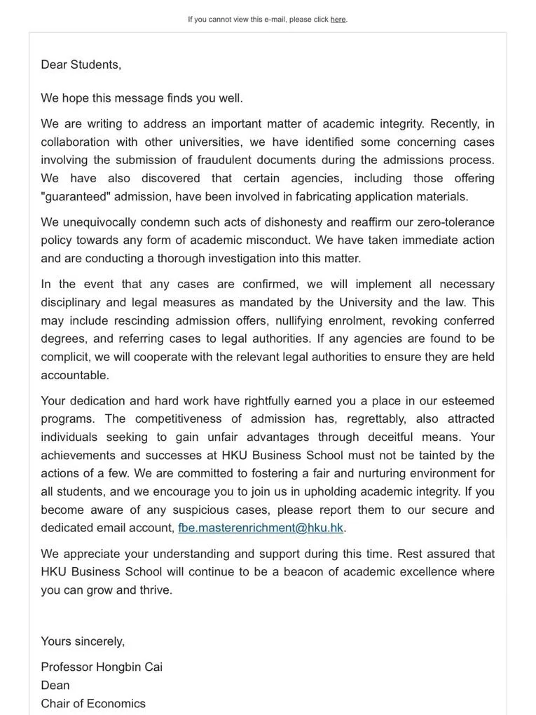 其实,早在今年的5月份,港大就曾打击过材料造假行为。5月20日,香港大学商学院向学生发送了一封邮件,邮件大意如下: