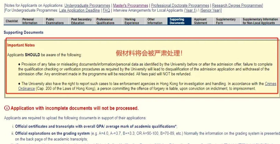 香港城市大学在上传申请材料的官网页面上特别发布了一条重要提示,提醒申请者必须提交真实的材料,还明确表示,如果发现使用虚假材料,一旦被核实,学生的录取资格可能会被取消,或者已发放的Offer可能会被撤回。