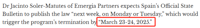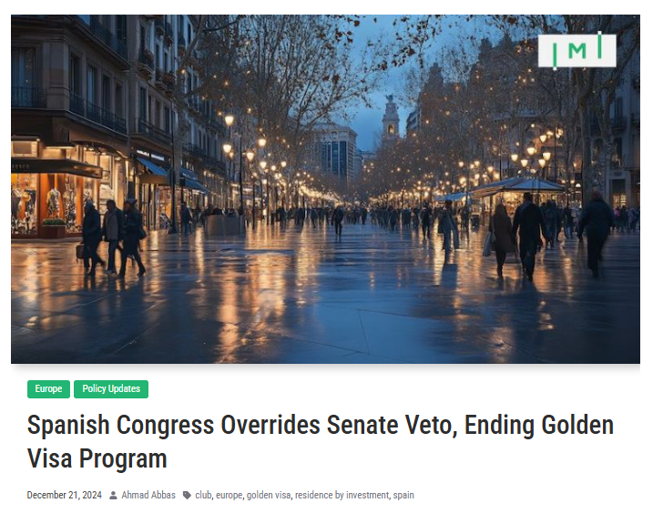 2024年12月19日,西班牙国会通过了《公共司法服务效率法》,推翻了参议院早前的否决,正式宣布将关停黄金签证计划。这标志着西班牙首相佩德罗·桑切斯在2024年4月提议终止该计划的倡议取得了最终成果。