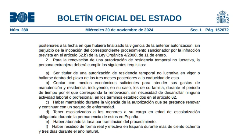 为顺应欧盟收紧移民政策的态度,西班牙政府于2024年11月20日发布官方文件,宣布非盈利签证再次恢复移民监,续签需要每年住满183天,续签周期仍为每两年一次。