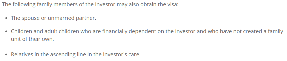 此外,西班牙政府允许黄金签证主申请人携带以下家属办理签证一同移居西班牙: