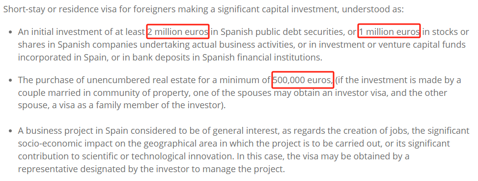 西班牙黄金签证要求外国个人在申请时满足以下任意一项投资条件: