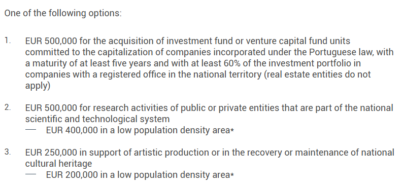 50万欧元用于购买投资基金或风险资本基金的份额,基金致力于为根据葡萄牙法律注册的公司提供资本,投资期限至少为五年,且至少60%的投资组合需投资于葡萄牙境内的公司(不包括房地产公司)。