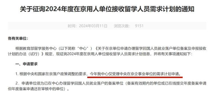 前段时间,教留服发布了一则《重要通知》:从2024年开始,教留服只接受在京注册的中央企事业单位的留学生落户申请。