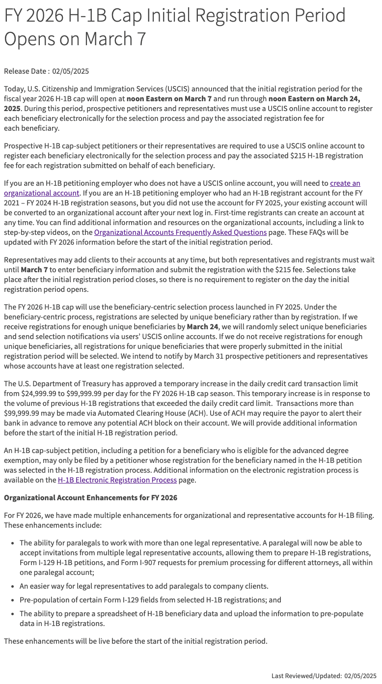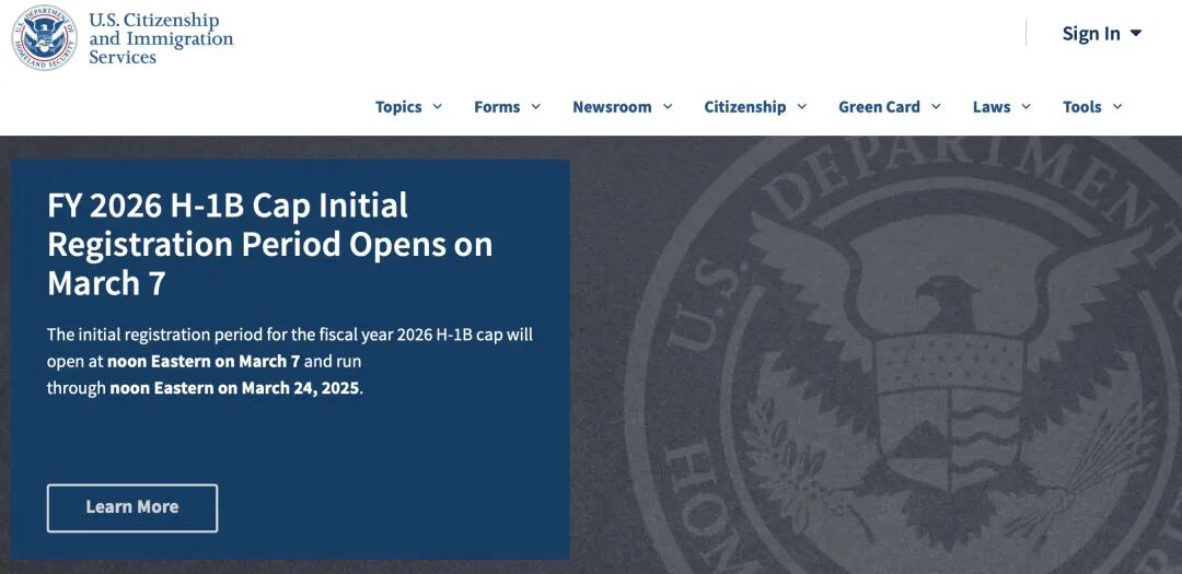 当地时间2月5日,美国移民局(USCIS)宣布,2025年(fiscal year 2026 H-1B cap)H-1B名额的初始注册时间将于美国东部时间2025年3月7日中午12点开启,并于3月24日中午12点截止。