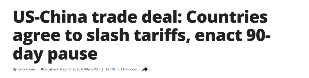 当地时间5月12日,中美日内瓦经贸会谈联合声明发布,双方大幅降低双边关税水平:双方将在未来 90 天内大幅削减对彼此商品的关税。美国的关税将从 145% 骤降至 30%,而中国的关税则从 125% 降至 10%。同时,双方还决定暂停非关税反制措施。