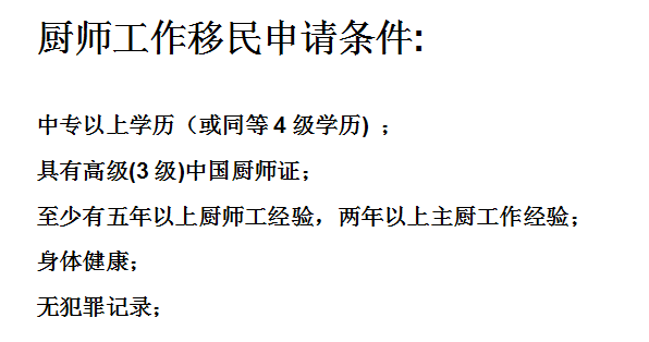 自2008年新西兰与中国签订世界贸易协议后,新西兰发放给中国厨师200个工作签证。作为中国特有的厨师签证,申请没有英语要求。